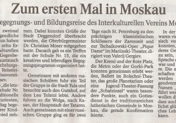 Schon zweimal hatten Moskauer Jugendliche Deggendorf besucht, nun haben zehn Jugendliche und zehn Erwachsene des Interkulturellen Vereins Mostik einen Gegenbesuch gestartet. Der Austausch war intensiv und abwechslungsreich, die engagierte Reiseleitung lag bei der Vereinsvorsitzenden Katharina Bakaev. (mehr …)